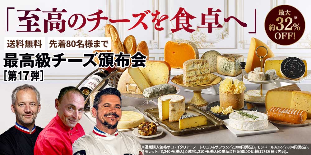 通常、いくらチーズが好きでも知識のない状態で選んだところで何が本物かさえわかりませんし、自分で選ぶとチーズの種類の幅が狭まってしまうこともあるでしょう。しかし、最高級チーズ頒布会であれば、月3種、それも、チーズ熟成士の巨匠や国家が認めたM.O.F.チーズ熟成士と、その道のプロフェッショナルが手がけたチーズが届きます。